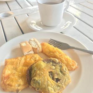 現地川のほとりでコーヒーとバナナの揚げ物のおやつを食べて、船に乗船。川を上りながら、天狗猿探し。