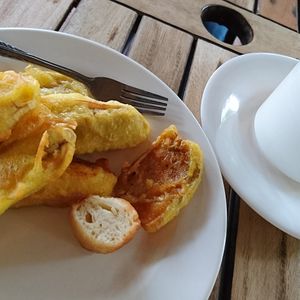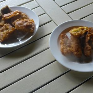 バナナやサツマイモの甘い天ぷらやドーナツで移動の疲れが取れました。