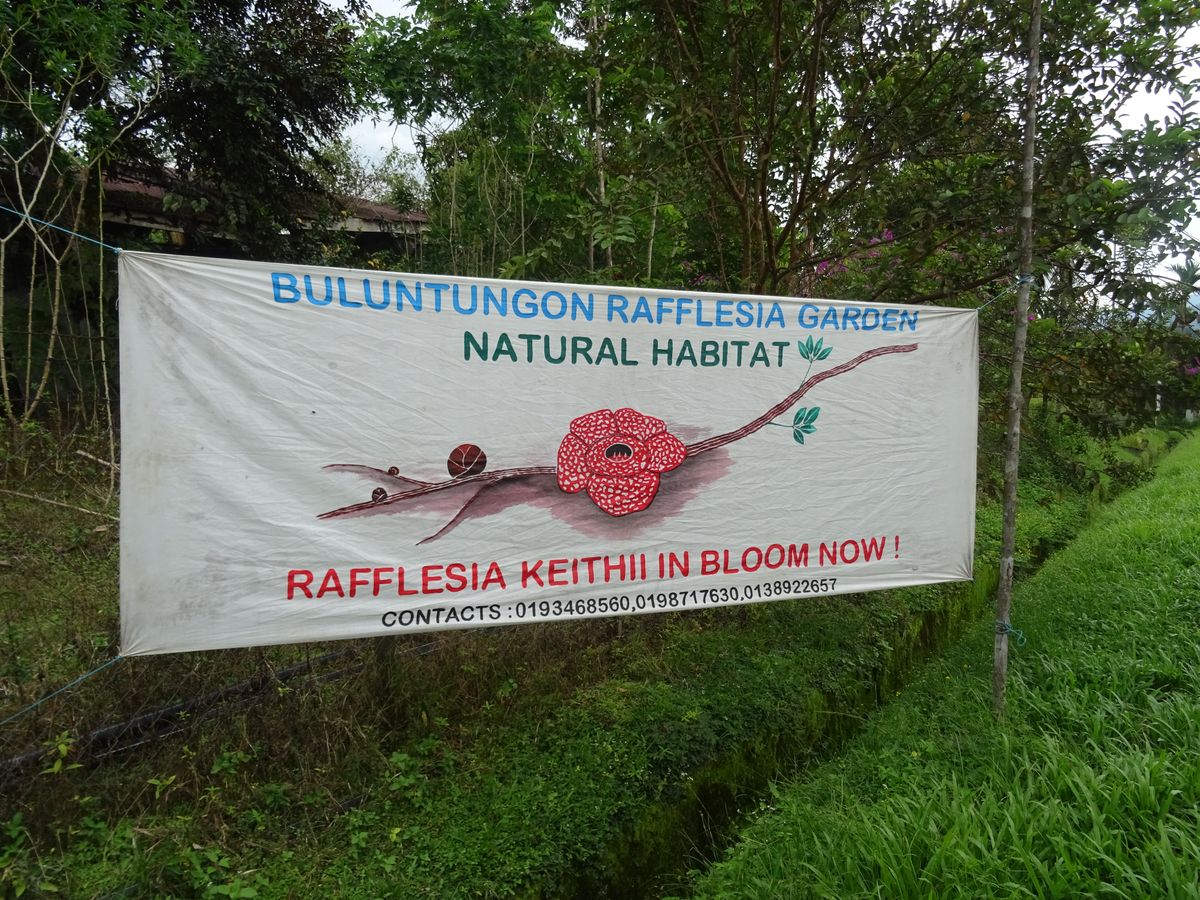 植物園にあったラフレシアの開花チラシは、残念ながら1週間前の開花で、今は見られないとのことであきらめていましたが、帰り道にラフレシア開花の横断幕が。ここもまずまずのどろんこ道でしたが、咲いたばかりのラフレシアを見学することができ、うれしさも倍増。