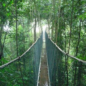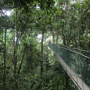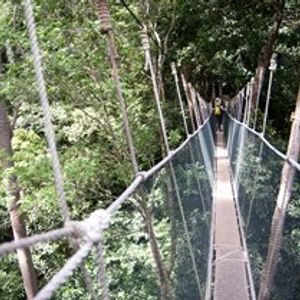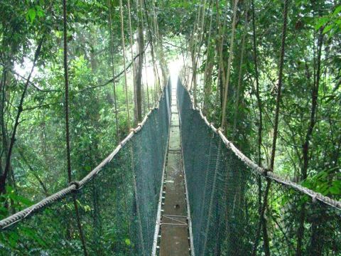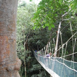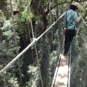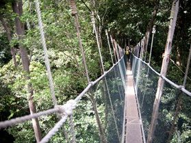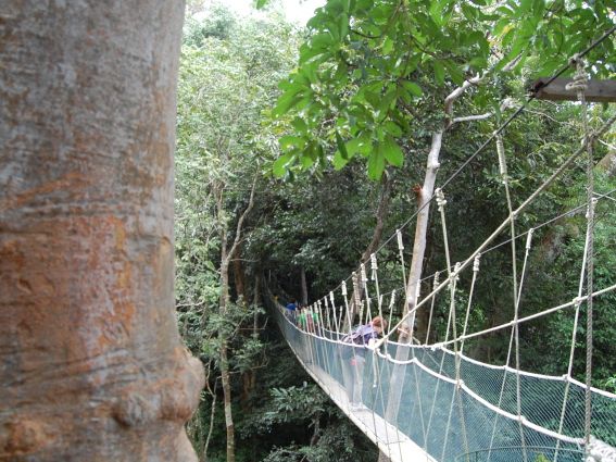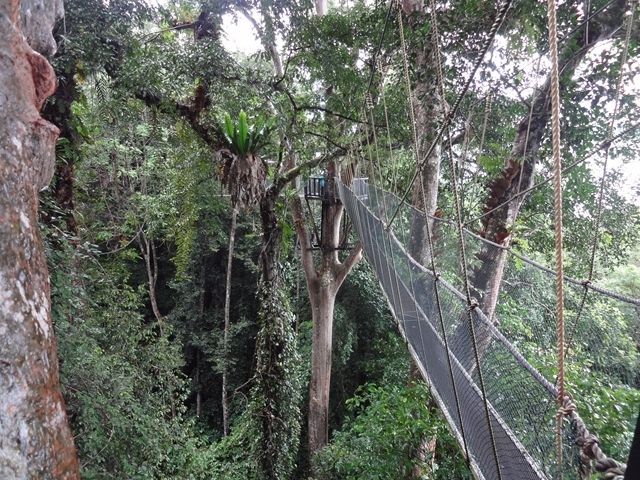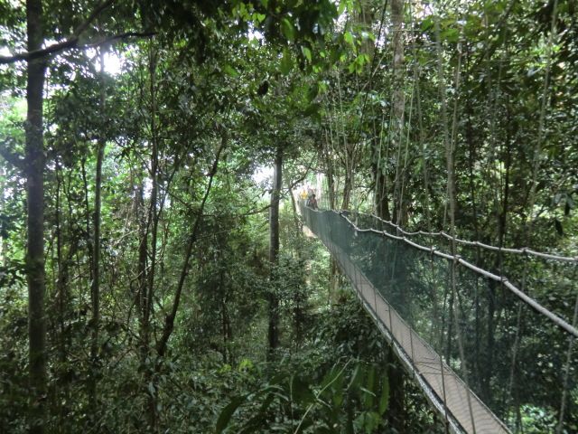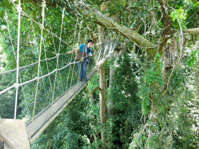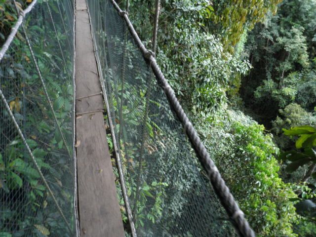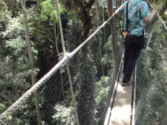 キャノピーウォークは木々が高く、うねうねと曲がった階段(木々で作られた)をひたすら上り、地上高くにつるされている橋を200M程渡ります。虫もあまりおらず、マイナスイオンが発生している感じです。