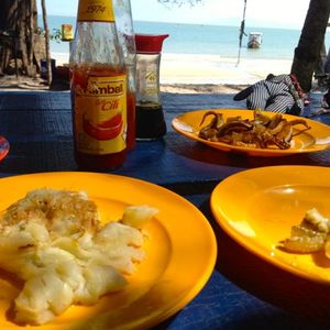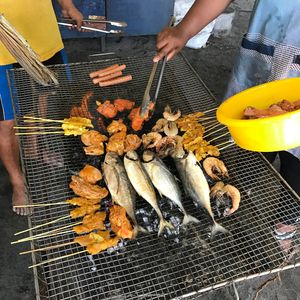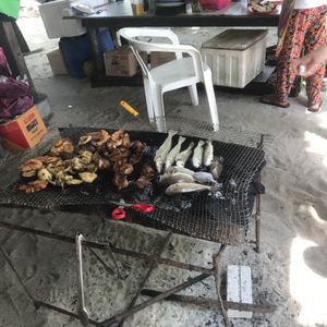 釣った魚と鶏肉、イカ、海老、ナスなどをBBQにしてくれて美味しく頂きました。ビーチでは