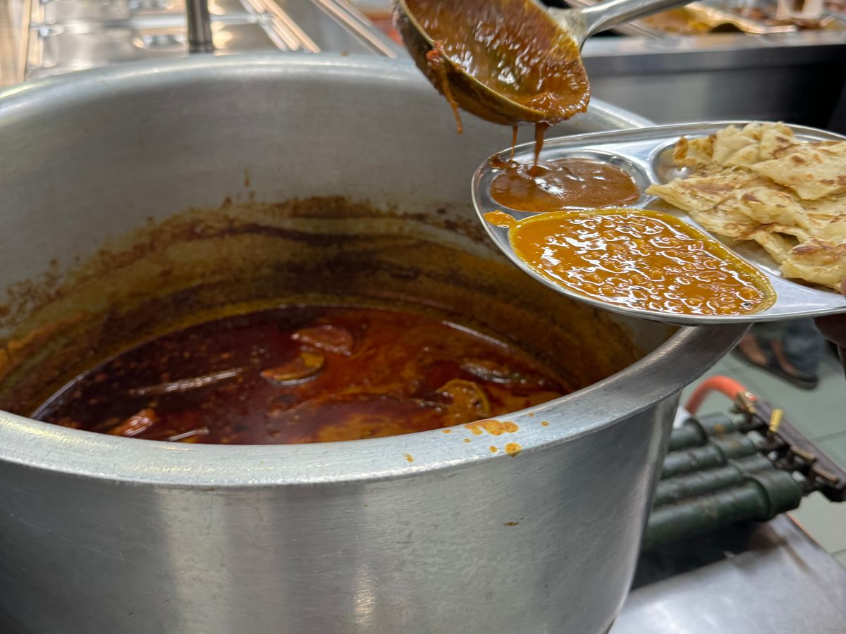 次は 「頌記」へ牛肉麺とスープ。ここは試食の範疇ですが、家族3人で2人分出てきました。 またまた歩いて観光しながら、次はインド料理のおやつでロティチャナイとミルクティー。ロティは1人分を3人でつまみました。それでも多い。