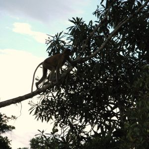 テングザルは、10数人乗りのモーターボートで川を進みテングザルの居る地点に止まって木上にいる処を見ます。中国人団体が来ていてかなりの船が出ていました。居る場所までボートレースのように結構なスピードでした。人が多かったせいか遠くの木でしか見れなかったのですが、船長さんが船を操って、他のボートの間に入りいつもベストポジションにつけてくれました。また、ボートをオオトカゲをみつけいる木の下に着けてくれ間近で見れました。終わり頃近くにいたテングザルを見られました。