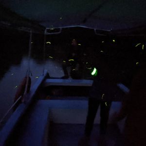 夕食後にホタル観賞クルーズにでかけましたが、大量のホタルがまとまって木に留まっており、とてもすばらしい光景でした。ボートの方にまできてくれるホタルもいて、手にとって観察することもできました。
