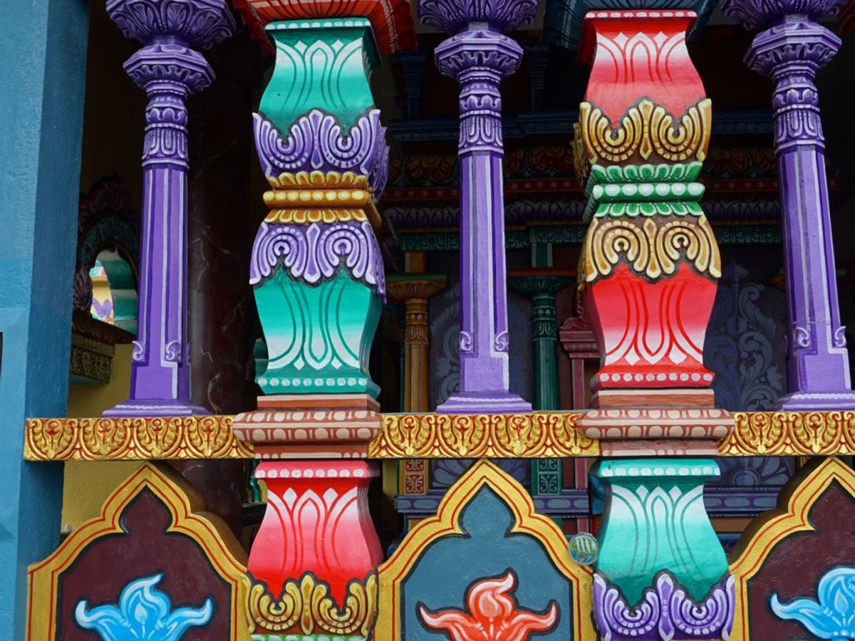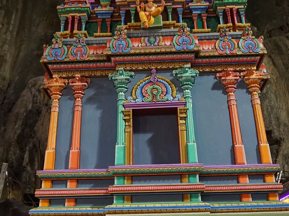 洞窟の中にあるヒンドゥー寺院は、鮮やかな色彩もあり