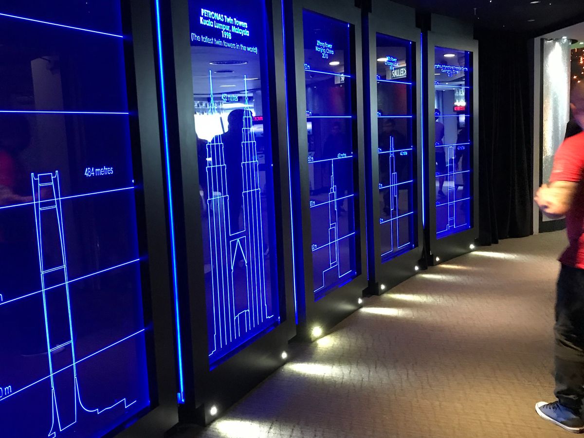 高速エレベーターに搭乗前の3Dホログラムの注意事項のアナウンスは、飛行機の離陸前のアナウンスとよく似た雰囲気で、ちょっと興奮しました。