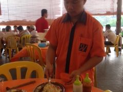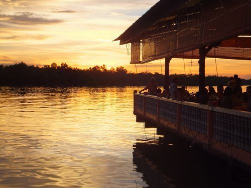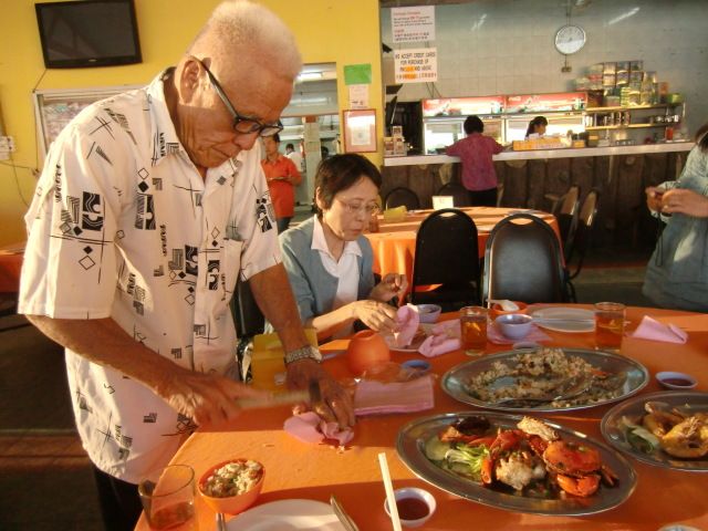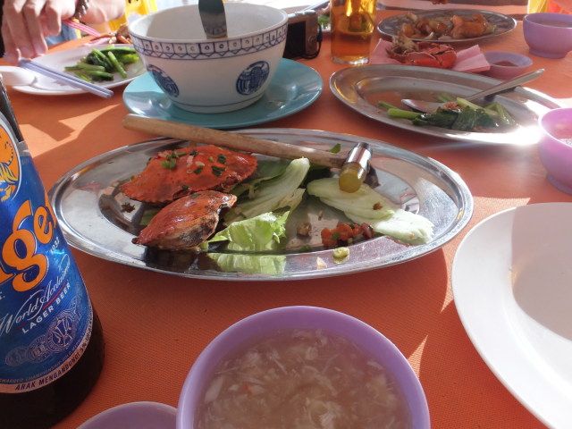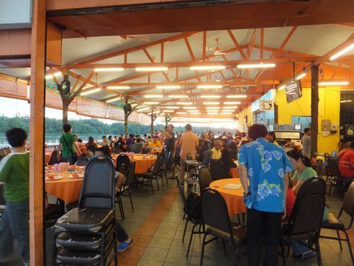 食事は、川沿いのレストランで、マレーの家庭料理というものの、私たちにとっては、中華料理でした。カニは一人1匹で、小さく、中身もぼそぼそ。チャーハンにイカの炒め物、スープ、揚げ物、フルーツ。はっきり言って値段に見合わない内容でした。
