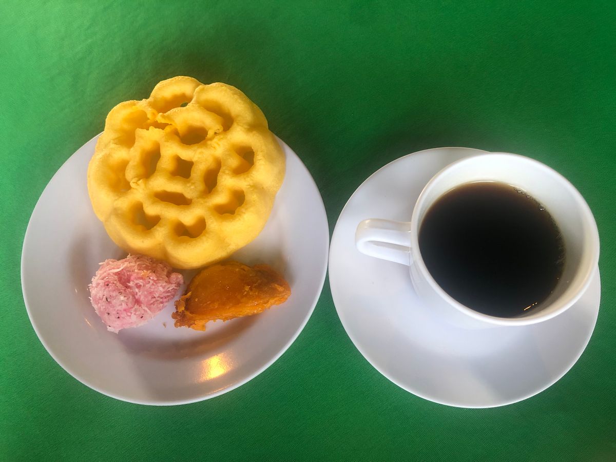 おやつにいただくお菓子はどれも、出されなければ食べてみないかもしれない現地のお菓子なので、この機会にいただけて良かったです。写真の3種類をいたたきましたが、ピンクのものは甘いおもち、お花みたいな黄色い大きなお菓子はスナック菓子でサクサクした素朴な甘さ、もう
