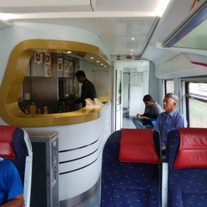なにはともあれ乗車です。ガイドの王(ワン)さんも一緒に乗車します。近代的な見た目に違わず、特急電車の乗り心地は良好です。列車には、日本では最近あまり見られなくなったビュッフェ車両もあり、サンドイッチ等を売っています。