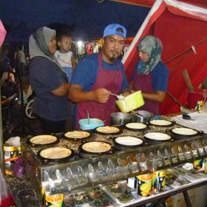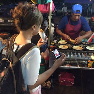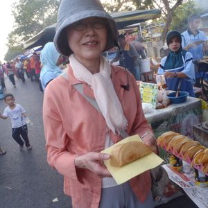 夜のマーケットのそぞろ歩きですが 日本語を話してくださるガイドさんと一緒だったので ちっとも不安がありませんでした。 屋台で目の前で作っている食べ物も 日本では見たこともなく 味の想像もつきませんが ガイドさんが説明してくださって それに興味を持つと 買ってくださいました。ガイドさんがいてくださってこその経験でした。美味しかったので 食べながら この屋台のお兄さんと一緒に ツーショットで写真をパチリ! それも ガイドさんがいてくれてこそできたことですね。