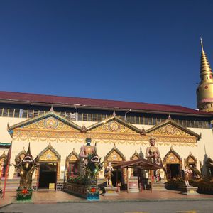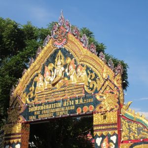 ですが、寝釈迦仏寺院に行ったところ、寺院の方に中国のドラマの撮影で「見学NG」と言われ、「え、なんで事前に分からなかったの!?」となりましたが、ガイドの「サムさん」が15分くらい交渉した結果、「寝釈迦仏の建物の手前からの写真だけならOK」となりました。写真は門のところから手を差し入れて撮った写真です。寝釈迦仏を間近に見られなかったのは残念でしたが、「サムさん」がいなかったら寺院の中に入ることもできなかったので、感謝しています。
