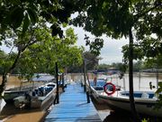 ジャングルリバークルーズが好きなので、大いに期待して参加しました。 街から車で2時間ほどかけて、クルーズの起点へ。 高床式の小屋が連なった先に小さな港がありました。 一緒に乗船したガイドさんは、熱心に川沿いの木々にいるテングザルや鳥を見つけて教えてくれました。 この日は3か所ほどのポイントでテングザルにあうことができました。 そのあと、いったん小屋にもどり、地元料理の夕食をいただいて、陽が落ちた頃