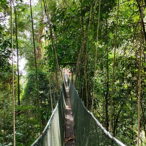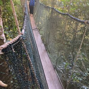 吊り橋を渡る前の登山(約30分)の時は、雨が降っており、大変でした。登山は、最初に木の階段があり、途中から岩場を歩きます。スリル満点の吊り橋は、渡るのに人数制限があり、6人まで同時に渡れます。合計で、5個の吊り橋があり、最後の吊り橋が1番長く高いです。高所恐怖症の人は気をつけてください。吊り橋の両サイドに網がありますが、すごく揺れるので怖いです。