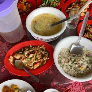 ランチは中華で、品数が多くチキンやイカが入った中華が美味しかったです。お茶は サバティで独特の味がするので好き嫌いが分かれるかもしれません。今回の参加者は、14人だった ので7人・7人に分かれて大皿を回る中華のテーブルで料理をシェアしました。日本人は、私たち夫婦以外はファミリーが2組、ご夫婦とその友人の方の1組が参加しておりました。私たちは小学生と中学生が いるファミリーと中華をシェアしましたが残ってしまうほどの量でした。そのため、朝ごはんは軽めか食べなくても良いかもしれません。他にも野菜や魚の揚げ物の中華やコーンの入った卵スー プ、スイカがありました。どれも美味しかったです!