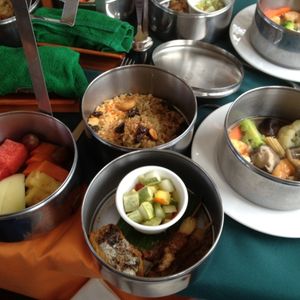 マレー料理をバイキングで食べることができます。香辛料が強いものや、魚の燻製など癖のあるものが多いです。アンブヤットという透明なくず餅のような現地料理があります。酸っぱい果物ソースで食べるのが本来の食べ方ですが、小豆をいれてデザートとして食べた方が私には口に合いました。