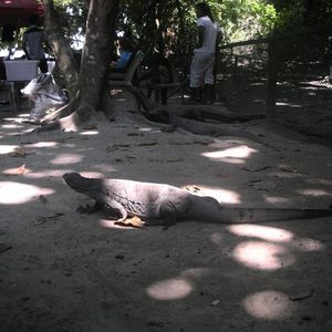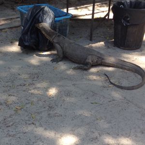 昼時になると人間の食べ残しを拝借しようと、野生のオオトカゲが何匹もフェンスをくぐり抜けてやってきます。人間を襲うことはないようなので近くで見ることができます。