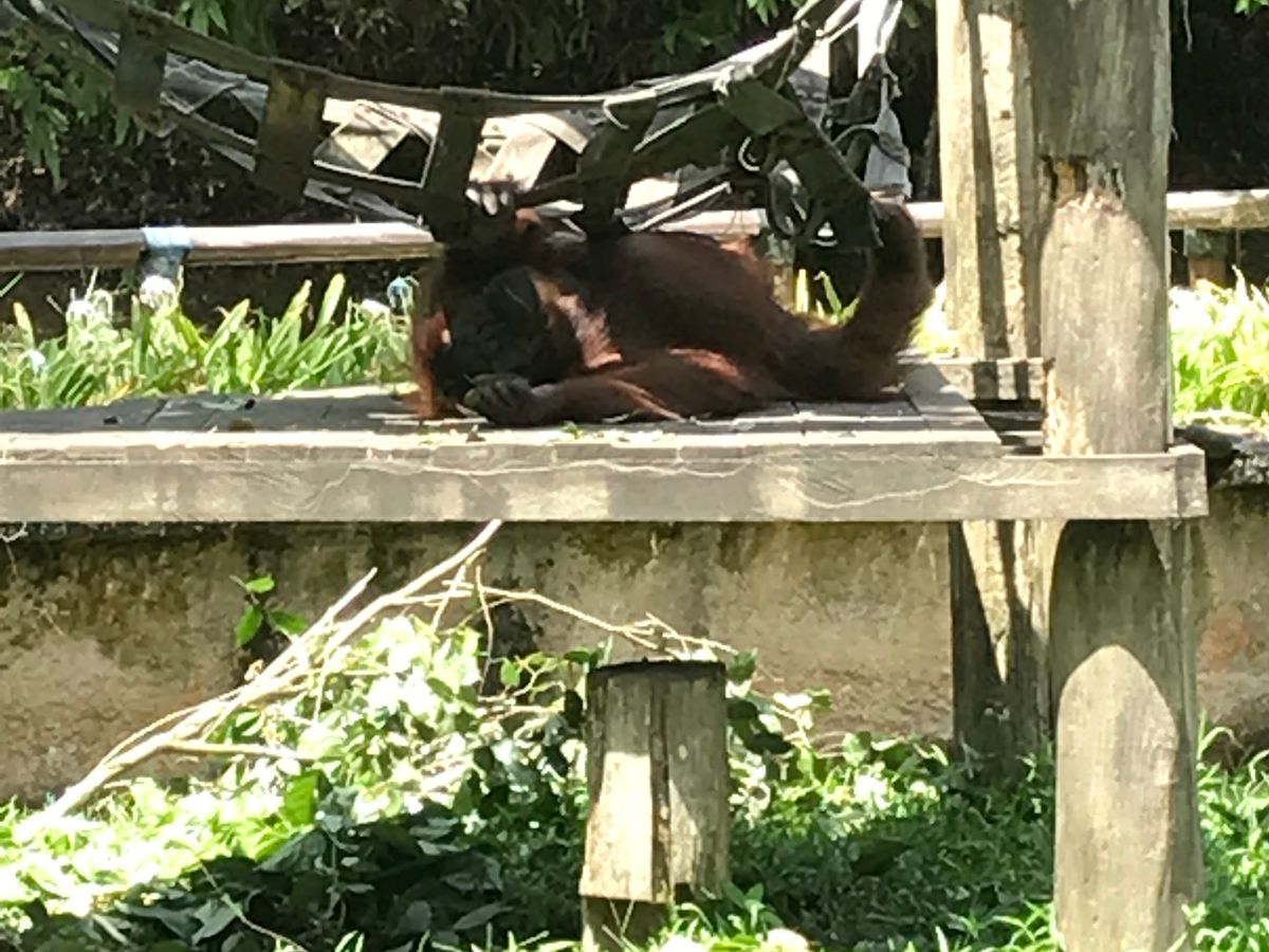 動物たちは日陰に入って涼んでいるものが多いです。夜行性の動物はずっと眠っています。私が行った日は、マレーグマ、テナガザル、テングザル、トラ、オランウータン、ピグミーゾウ、サイチョウが活発に動いていました。