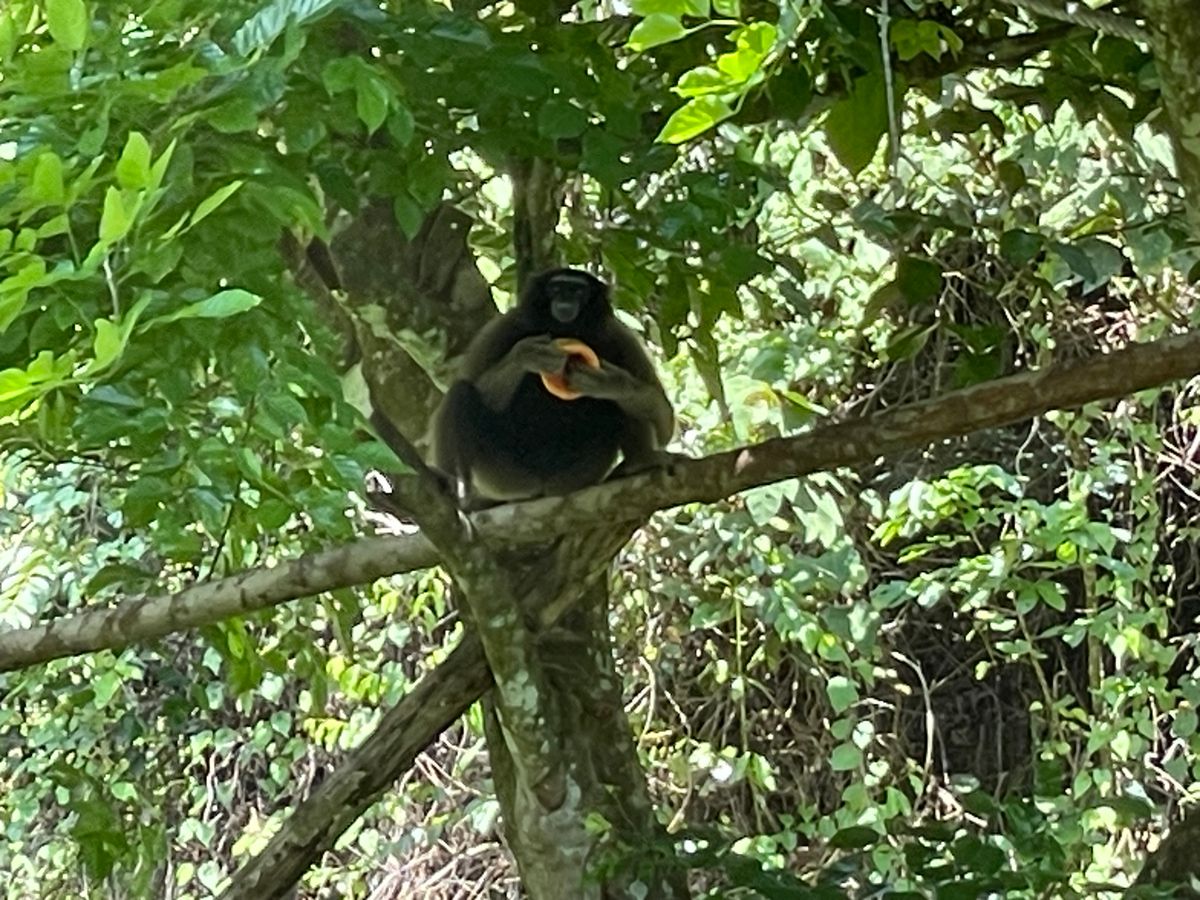 ハイライトはキャノピーウォークでギボンに遭遇できたことです。一頭だけですが我々人間に興味津々なのか、吊り橋の上に現れてしばらくその場でとどまってこちらの様子をうかがっていました。後続グループに通せんぼのように吊り橋の上にぶら下がっていたのには笑いました。最初は少し怖かったですが、人間との交流を楽しんでいる個体のように見えました。動物園とは違うイキイキとした姿に感動しました。