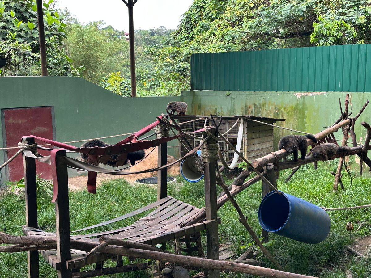 事前にボルネオ島の動物を予習しましょう。熊猫と言われてもパンダではなくビントロング(Arctictis binturong)で、哺乳綱食肉目ジャコウネコ科ビントロング属に分類される食肉類です。