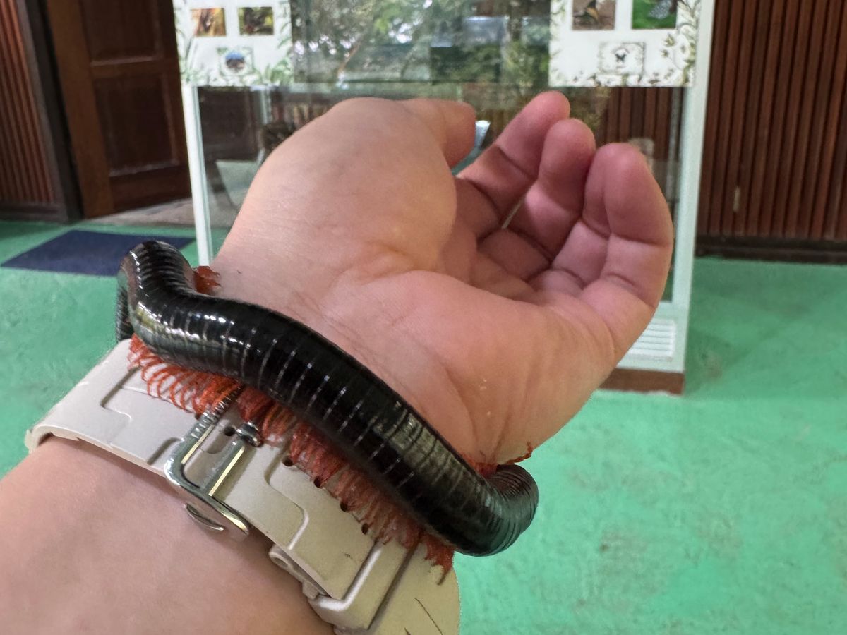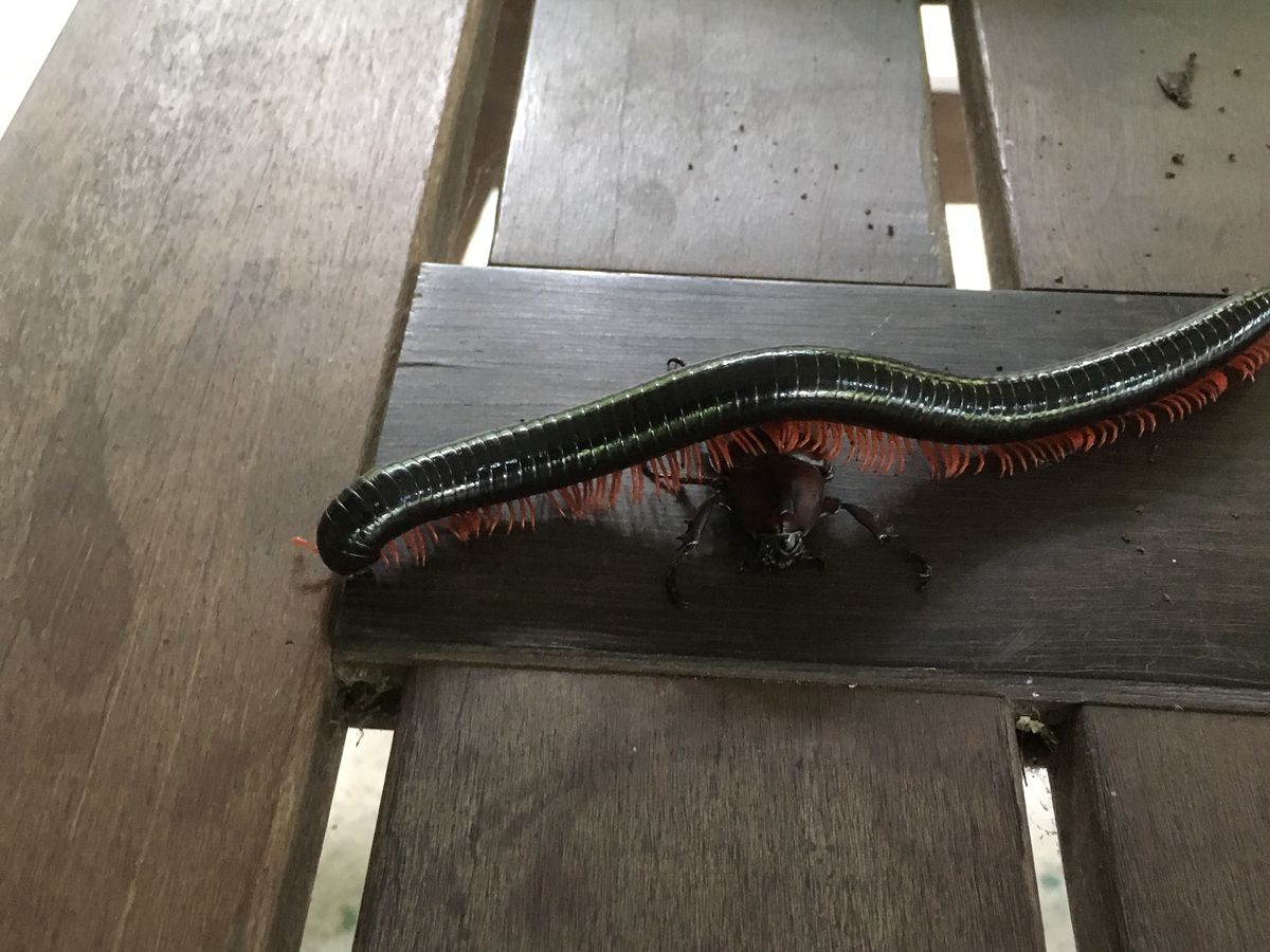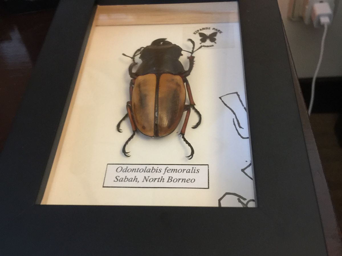 旅程としては、まず、コタキナバル市内のホテルから1時間くらい行った山中にある蝶の研究センターで、モーレンカンプオオカブトとアトラスオオカブトの標本作りをしました。実際には標本作りの「体験」で、既に綺麗に処理されている標本をピン留めする体験をします。選んだ標本は、後で立派な箱に入れてくれます。この時にモーレンカンプオオカブトとヤスデにも触らせてもらえました。