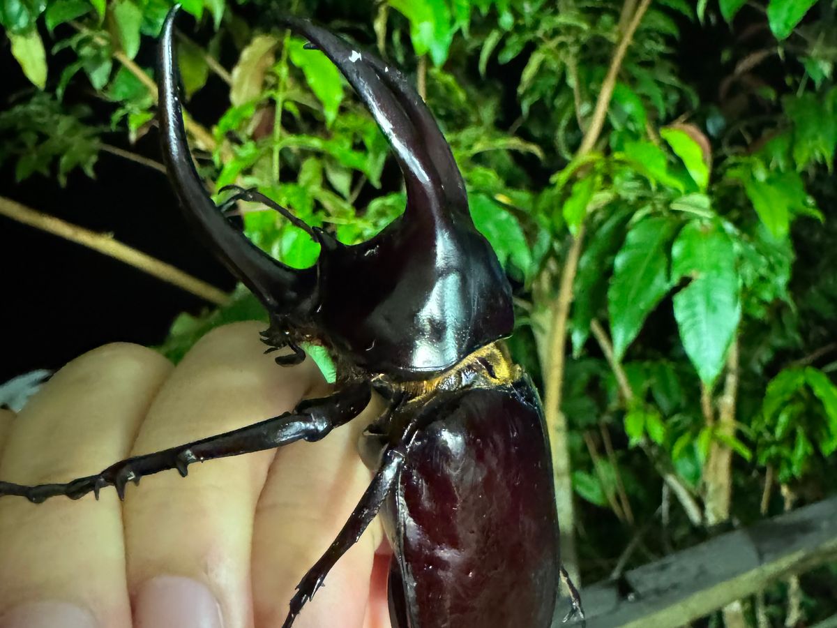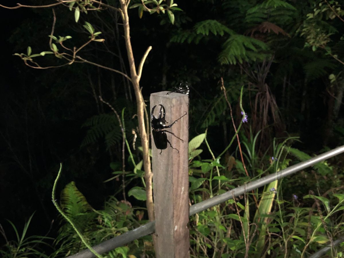15時から19時ごろまで大雨でしたが、20時からの観察では多くのカブトムシ、クワガタに加え、巨大なガのヨナグニサンや、見たこともない大きさのヒキガエルもおり、大興奮でした。