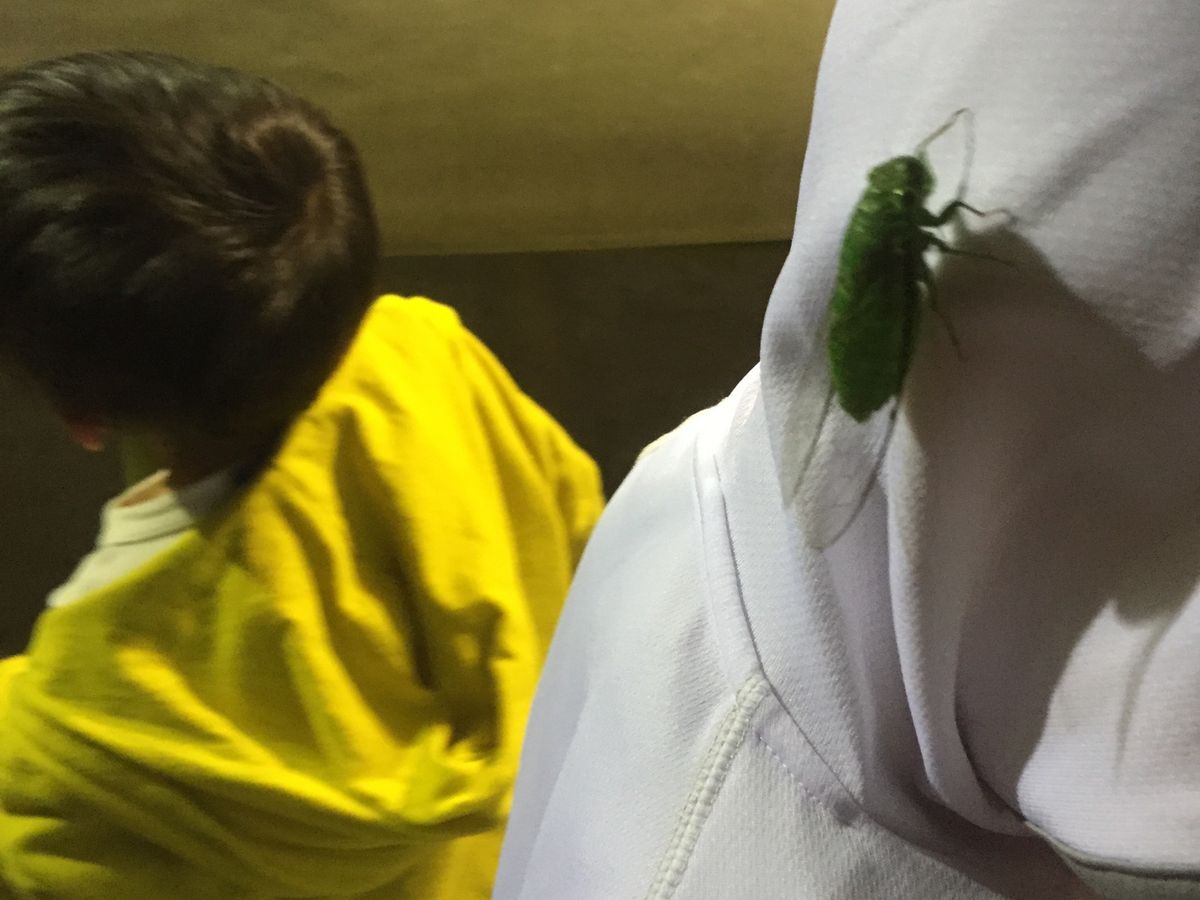 特設の白いシートの所にカブトムシやクワガタ、セミ、(蛾も...)がたくさん集まっていました。日本でみるカブトムシよりはるかに大きいサイズの昆虫たちがこれでもかと集まっていて子供たちは大はしゃぎ!! 2匹を地面に置いてカブトムシの対決をさせてみたり、クワガタに変えてみたり、飛ぼうとして羽を動かす姿を観察したり...