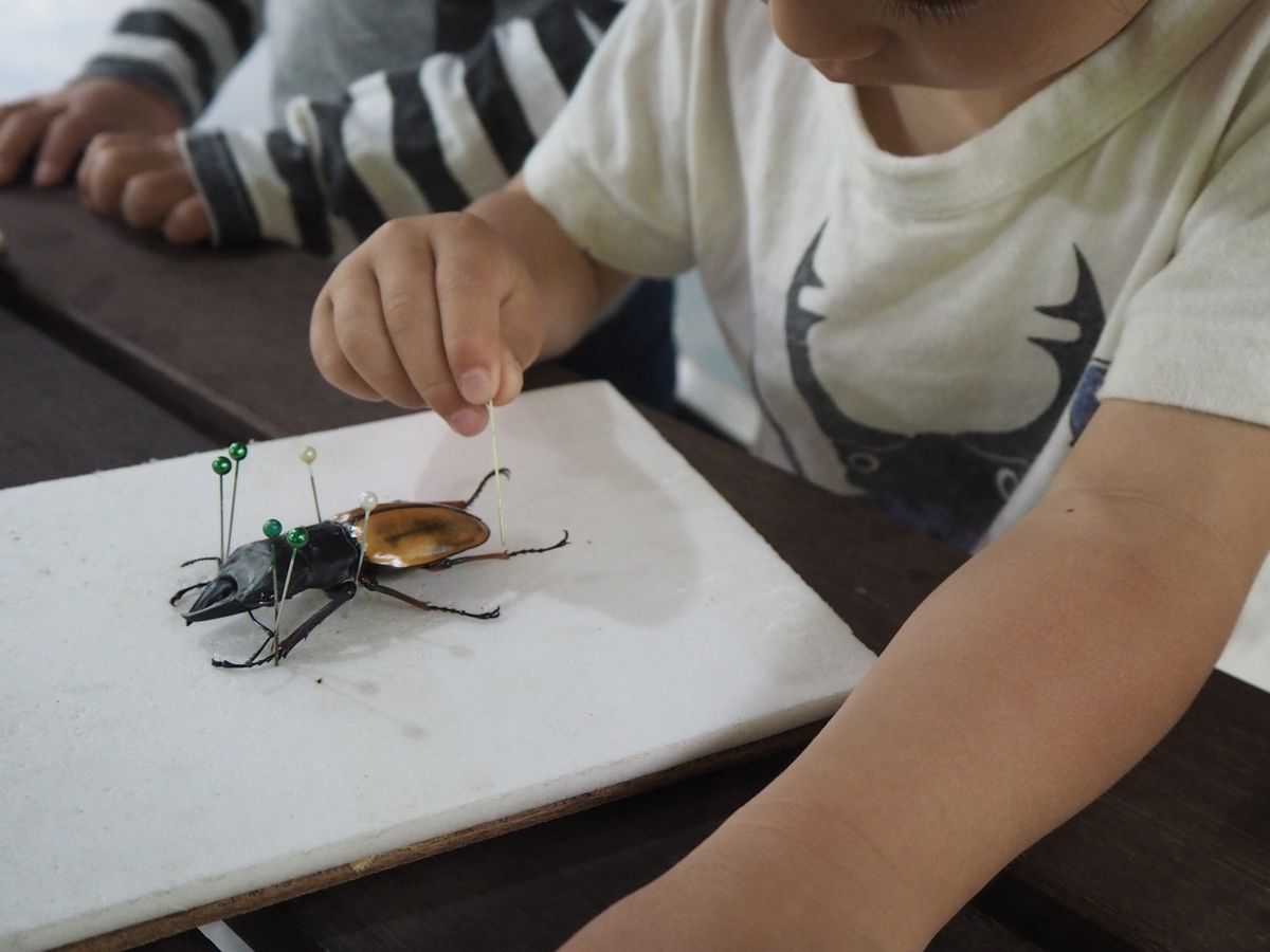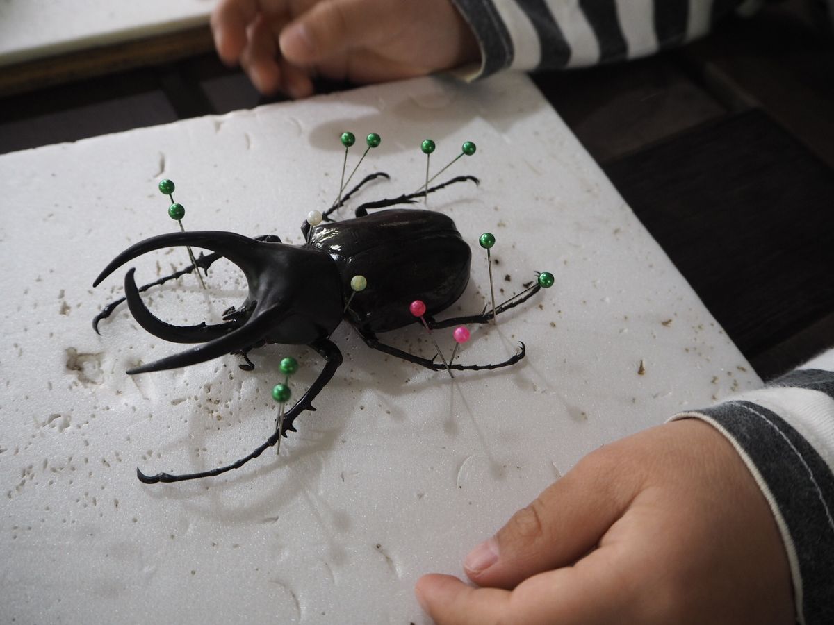 事前に用意してくださっていた昆虫のなかから好きなものを選び、針の指し方を教えてもらいながら固定していきます。すでに準備されているので簡単な作業で、10分ほどで終わります。