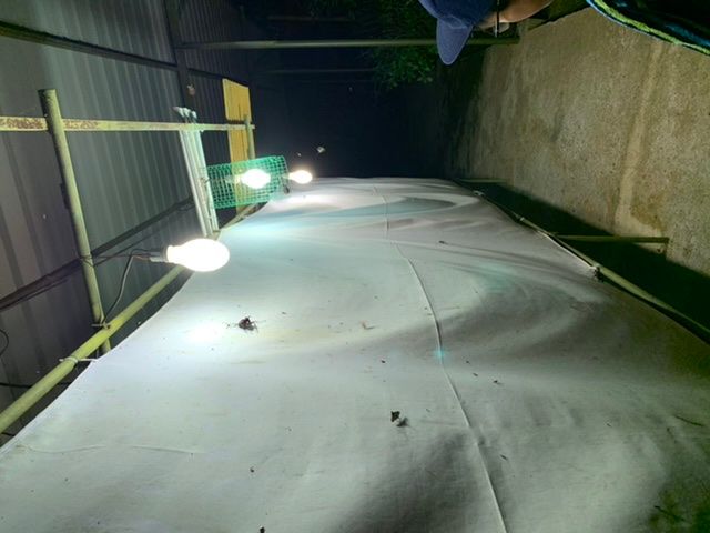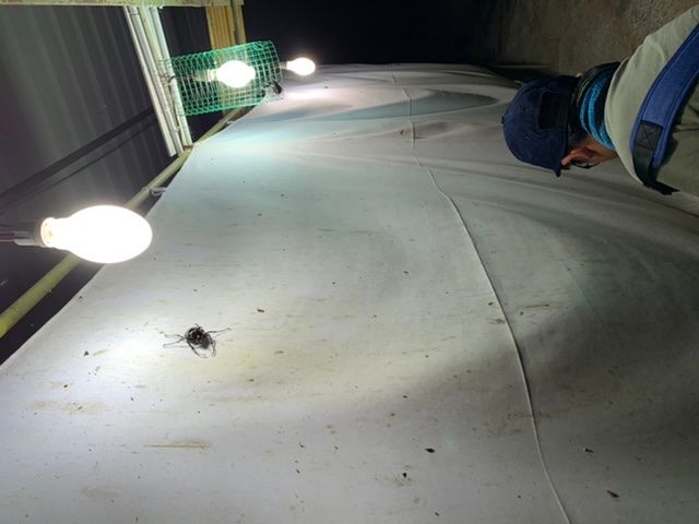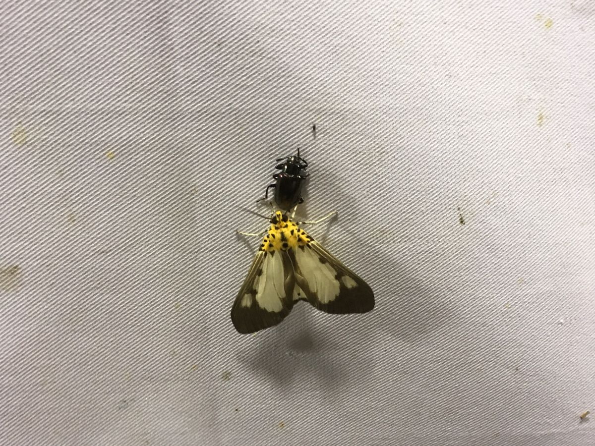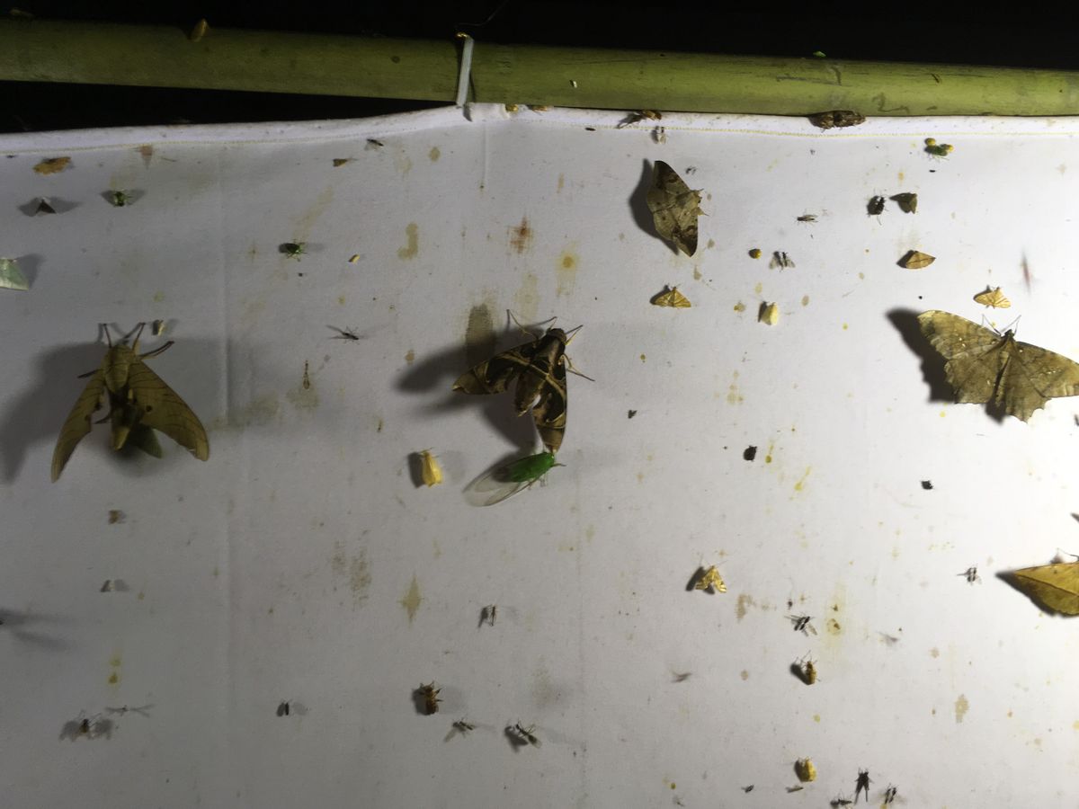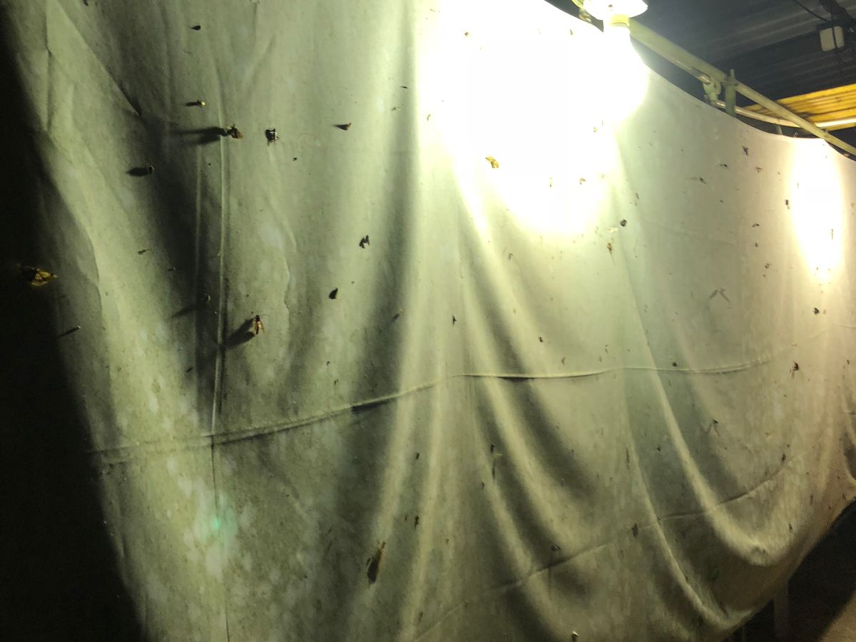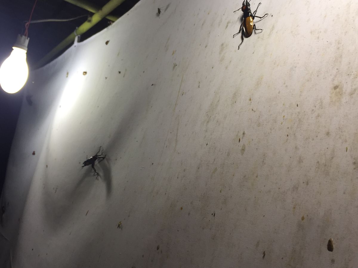そしてスタッフの人が仕掛けて置いたライトと白い幕へすでにたくさんの昆虫が集まってました。