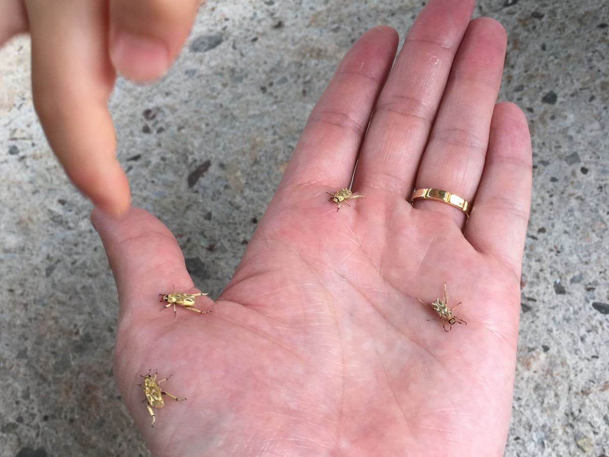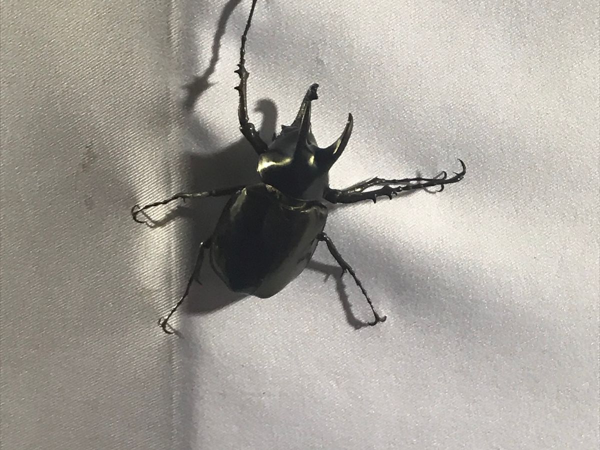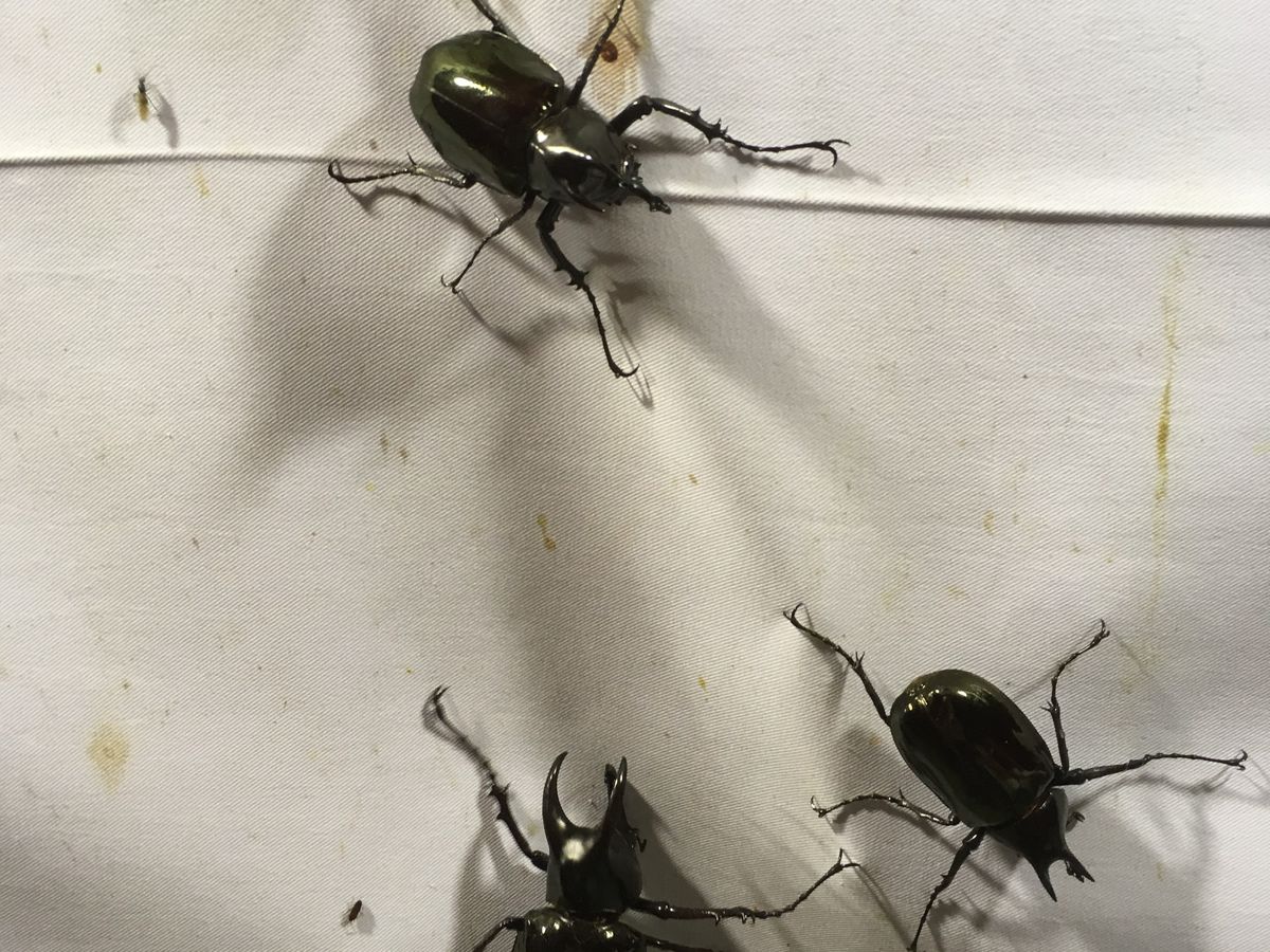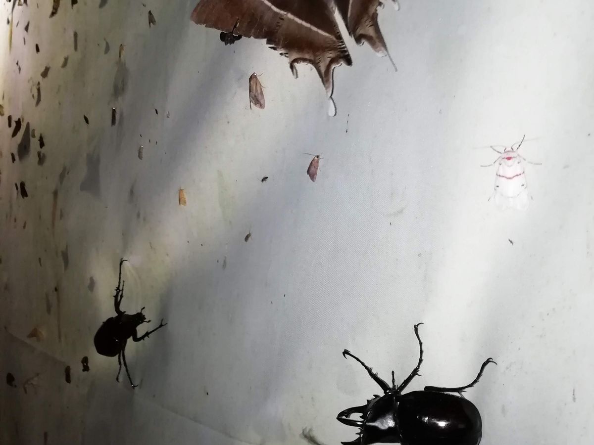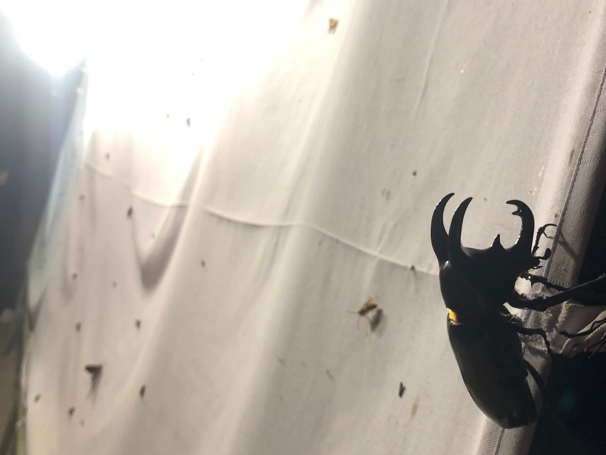 最後の点に関して言うと、白い布の前に立つと、虫除けをしていっても関係なく、カブト虫だけでなく、大小のセミや蛾、羽アリなどが髪の毛や肌、服(たまに服の中)に容赦なく付いてきますので、それなりの覚悟が必要です。