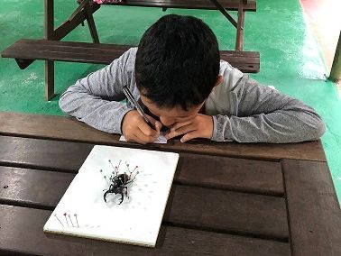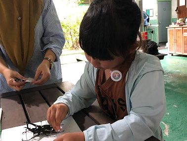 標本作りは既に薬につけてあり、形を整え針刺しだけなので、子どもはちょっと物足りなかったようです。でも、その後、小さな昆虫博物館や小さな温室を周る時は、昆虫探しに夢中になってました。