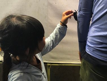 夕食を食べた後はお待ちかねの昆虫見学タイム。光を照らされた白い布に昆虫たちがたくさん集まってきます!