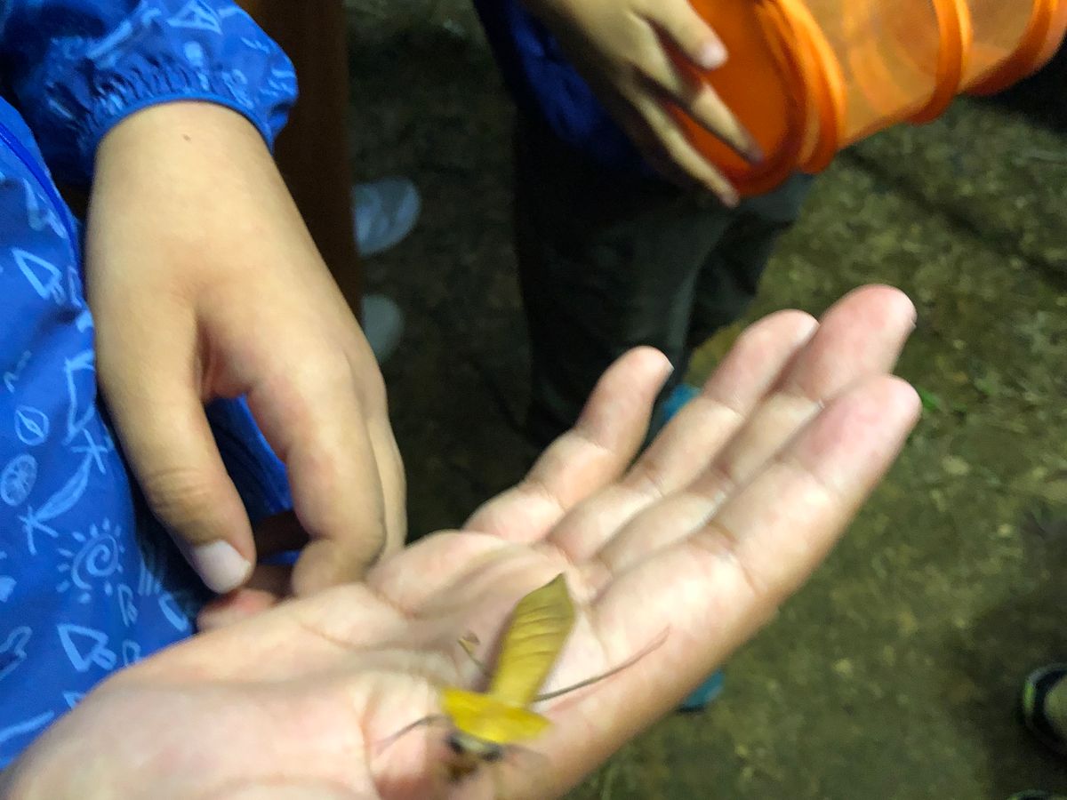 標本作りでは途中、山中にライトアップを仕掛けたところまで移動して飛んできた!?カブトムシ、クワガタ、セミ(世界で一番大きいらしい)、枯葉カマキリ等々を子どもも大人も捕まえたり写真を撮ったり楽しいひと時でした。