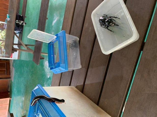 日本で見ることのないカブトムシ(モーレンカンプ)や枯れ葉カマキリ、ナナフシなども昆虫トラップで見ることができ、息子は大興奮でした。