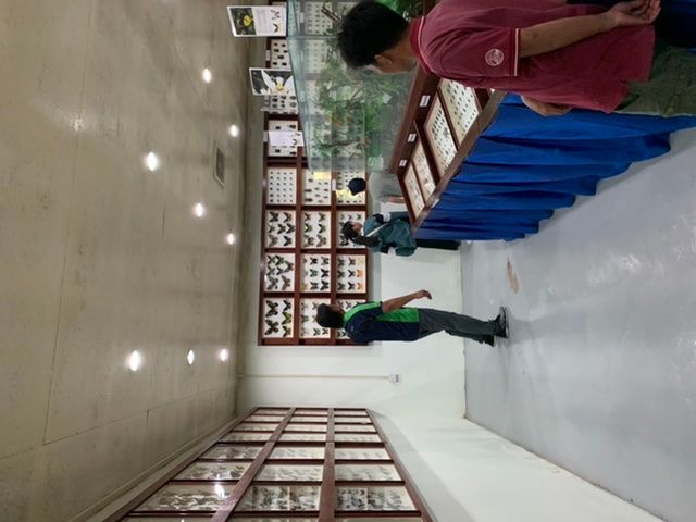 次に、蝶園の中をガイドさんと一緒に回ります。蝶園の中には、標本が展示してあるところと、蝶が実際に飛んでいるところが見られます。この時に、後で虫を見学する場所の下見もできます。私たちの参加した時は、研究センターの研究者の方も一緒に回ってくれたので、分からないことはすぐ聞くことができました。