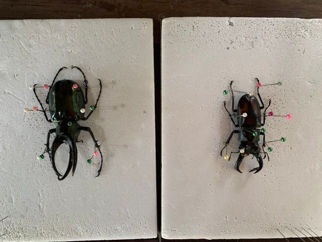 標本づくりは、兄妹でそれぞれカブトムシ、クワガタと数あるなかから選ばせてもらえて、息子はパリ―二股クワガタ?があったことに大喜びでした。