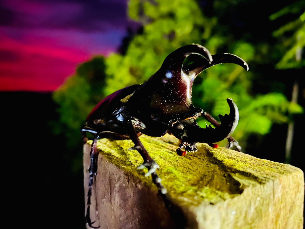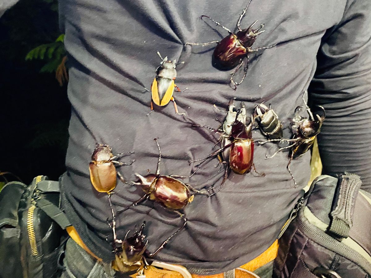 3歳と5歳の子供と一緒に参加しました。この旅の目的がモーレンカンピカブトムシをゲットすることでした。子供のみ標本付きのコースを予約し、一人はクワガタ、一人はカブトムシの標本を作らせて頂きました。できたら、自分で名前を書いてすごく綺麗な箱に入れて頂き、一つしかない宝物になりました。ご飯の後は車道、とても綺麗な山の上からの夕日がみえ、ガイドさんが車を止めてくれて写真を撮ったりもできました。そして早速夜になり、、ドキドキしながら虫の集まる場所に行くと、、子供の喜ぶ声が先に聞こえ、、クワガタやモーレンカンピカブトムシ、色とりどりの蛾やカナブンが徐々に集まってきて、人面顔のカメムシの仲間や首の長いヘビトンボという虫など始めて見る虫ばかり!!そうしてるうちにガイドさんがナナフシを見つけてくれたり、、子供達も先ほど作った標本と同じクワガタやカブトムシが実際に生きてる姿で集まってきて捕まえることができ本当に大喜びでした。島で蝉の鳴く声も聞こえましたが姿は見えなかったのが、ここには集まってきて綺麗な緑色の蝉や、クマゼミの大きい版みたいな蝉や本当珍しいたくさんの虫に出会えとても貴重な経験になりました。本当にありがとうございました!!