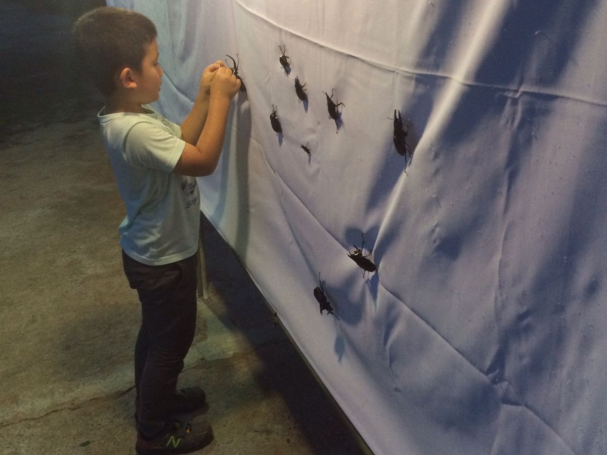そのあとすぐに標本作りでした。ガイドさんの丁寧な説明のあと、大きなカブトムシを細い針で板に固定します。子供には生きたカブトムシを捕まえる前のいい手慣らしになったと思います。