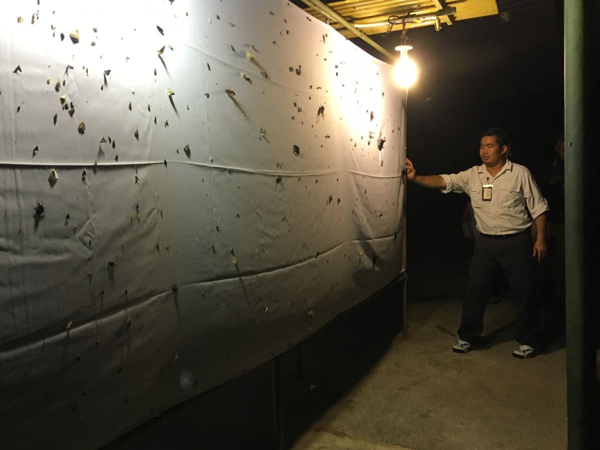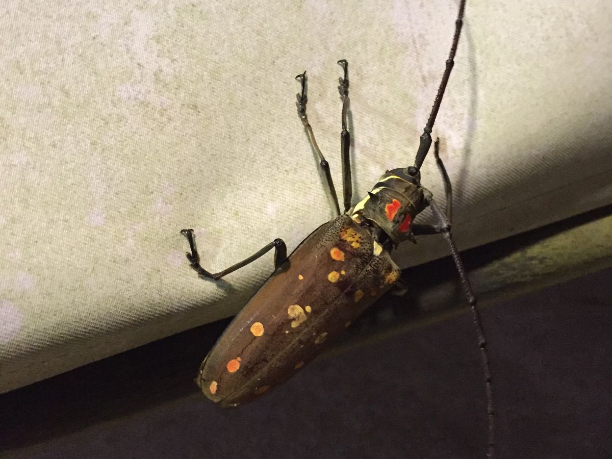 生憎の雨でバタフライガーデンでは、飛んでいる蝶をあまり観察することが出来ませんでしたが、、メインイベントの昆虫の見学(白いシーツをライトアップさせて昆虫を集めます)ではコーカサスオオカブト、クワガタ、カミキリムシを沢山、見ることが出来ました。