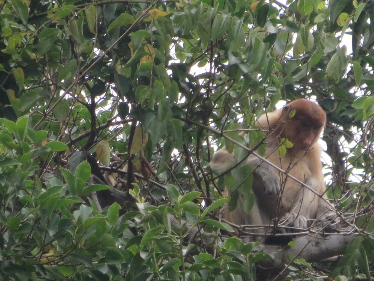 ジャングルの中の川をボートで移動しながら、ガイドさんと船頭さんが指さされる方向を必死になってキョロキョロします。素人では全く分からない所を指さされまして、よ~く見ると、いましたテングザル。ガイドさんは過去に何度か見れなかったこともあったとおっしゃってましたが、ボートに乗り込んで5分ぐらいで見る事が出来ました(笑