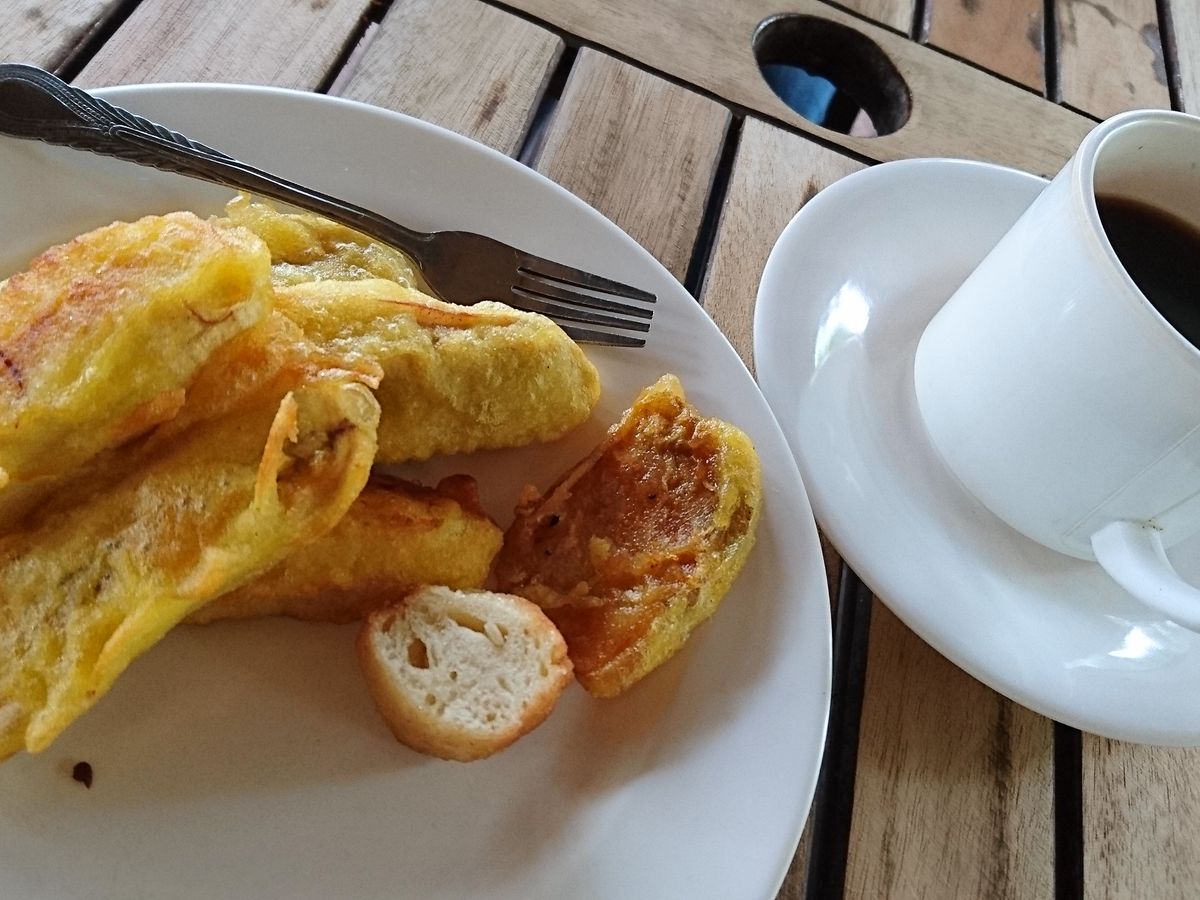 河に到着して、バナナやイモなどのフライとコーヒーの軽食。