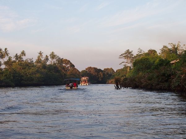 船はエンジン船で、先ほどの団体も含めて数隻に分乗します。途中1回の下船を挟んでテングザル(カニクイザルやオオトカゲもいます)と蛍を楽しみます。数は季節と運次第ですが、ローカル感あふれる川の雰囲気と合わせて、これは見物です。野生動物ですので、迷惑にならない行動が望まれます。