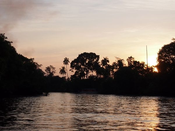 リバークルーズは、猿を探しながら進みます。私は友達と二人で参加、その他に7人のお客さんで、和気あいあいと探します。私たちには、全く見つけられませんが、ガイドさんは、次々に猿を見つけてくれました。どうして見つけられるのか!不思議でした。夕暮れ時の景色も素敵でした。