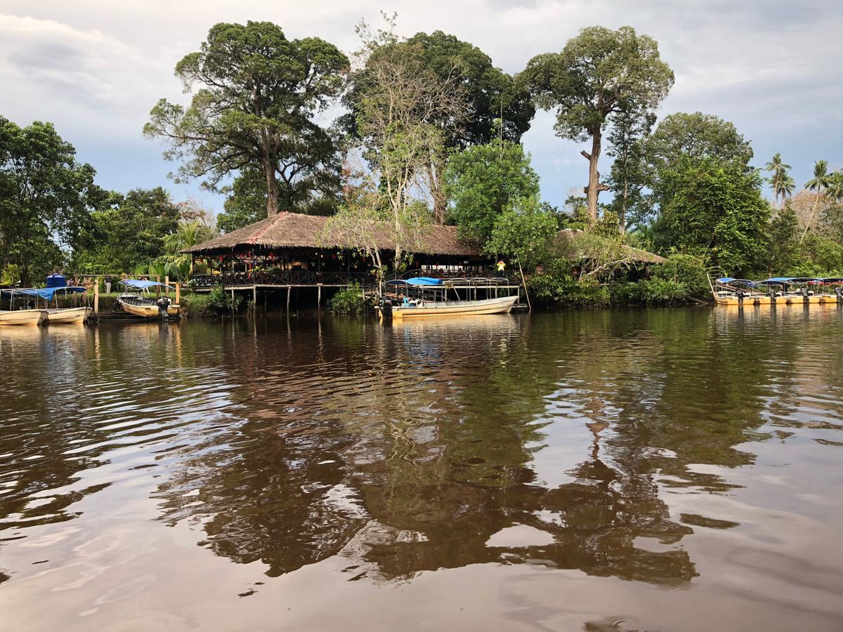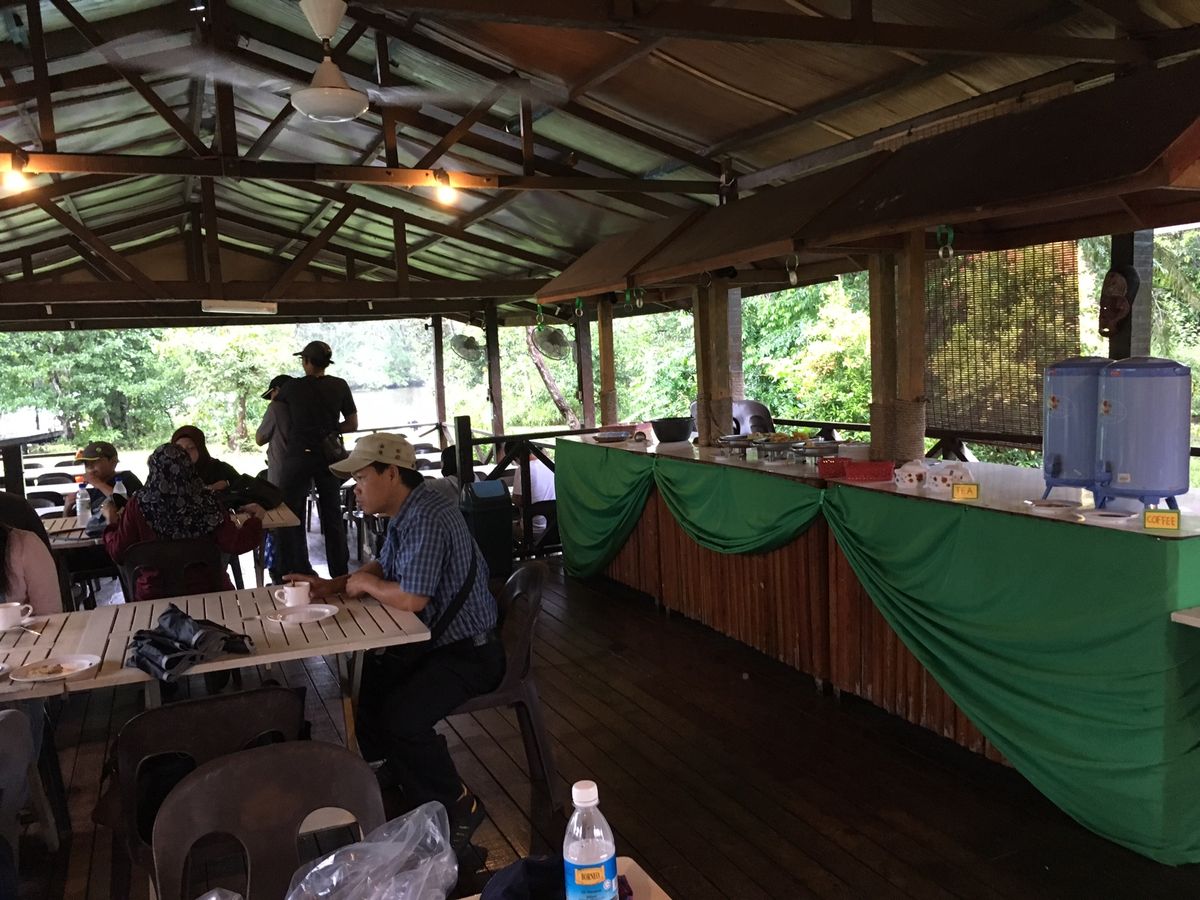 トイレを済ませてキリアス川へ。約2時間の道のりは休憩なしでした。到着後バナナとさつまいもの揚げ物・マレー版おしるこ、紅茶・コーヒーが提供されます。