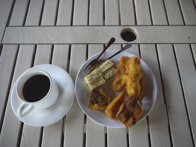 軽食はバナナの揚げ物とコーヒー。夕食はマレー料理です。