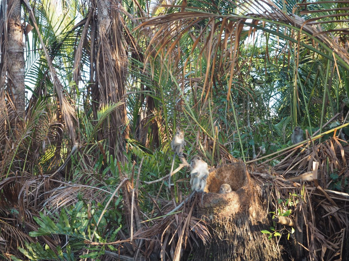 テングザルも何匹も見えましたが、オオトカゲがヤシの木の中腹にとまり、全長2mを超す大きな身体でゆっくりと休んでいるのを見つけた時には歓声が沸きました。