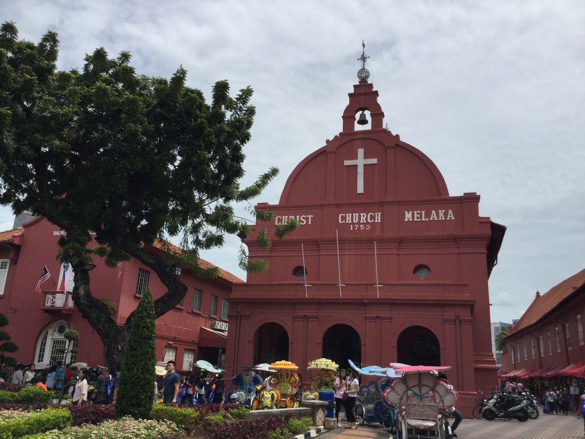 マレーシアの世界遺産「オランダ広場」。「マラッカ・レッド」と呼ばれる赤茶色に染まった教会や周囲の建物が歴史の重みを感じさせてくれました。