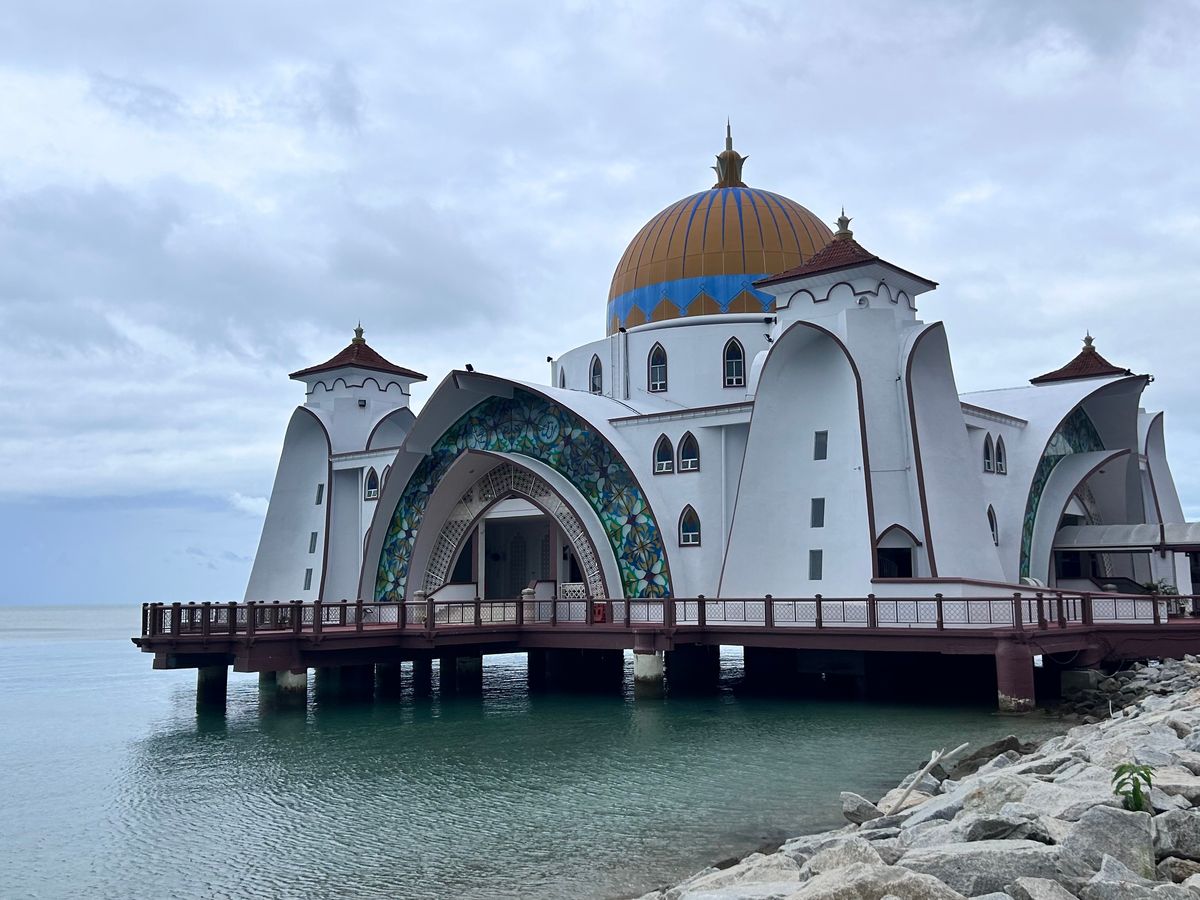 その後、海の中の可愛いマラッカ海峡モスク(水上モスク)を訪問し、左側の護岸から撮るモスクの写真は可愛く有名です。モスク内を観光するには女性は髪を隠し、男性は短パンの場合は脚を隠す衣装を借りる必要がありますが、可愛い形をしたモスクは美しいです。