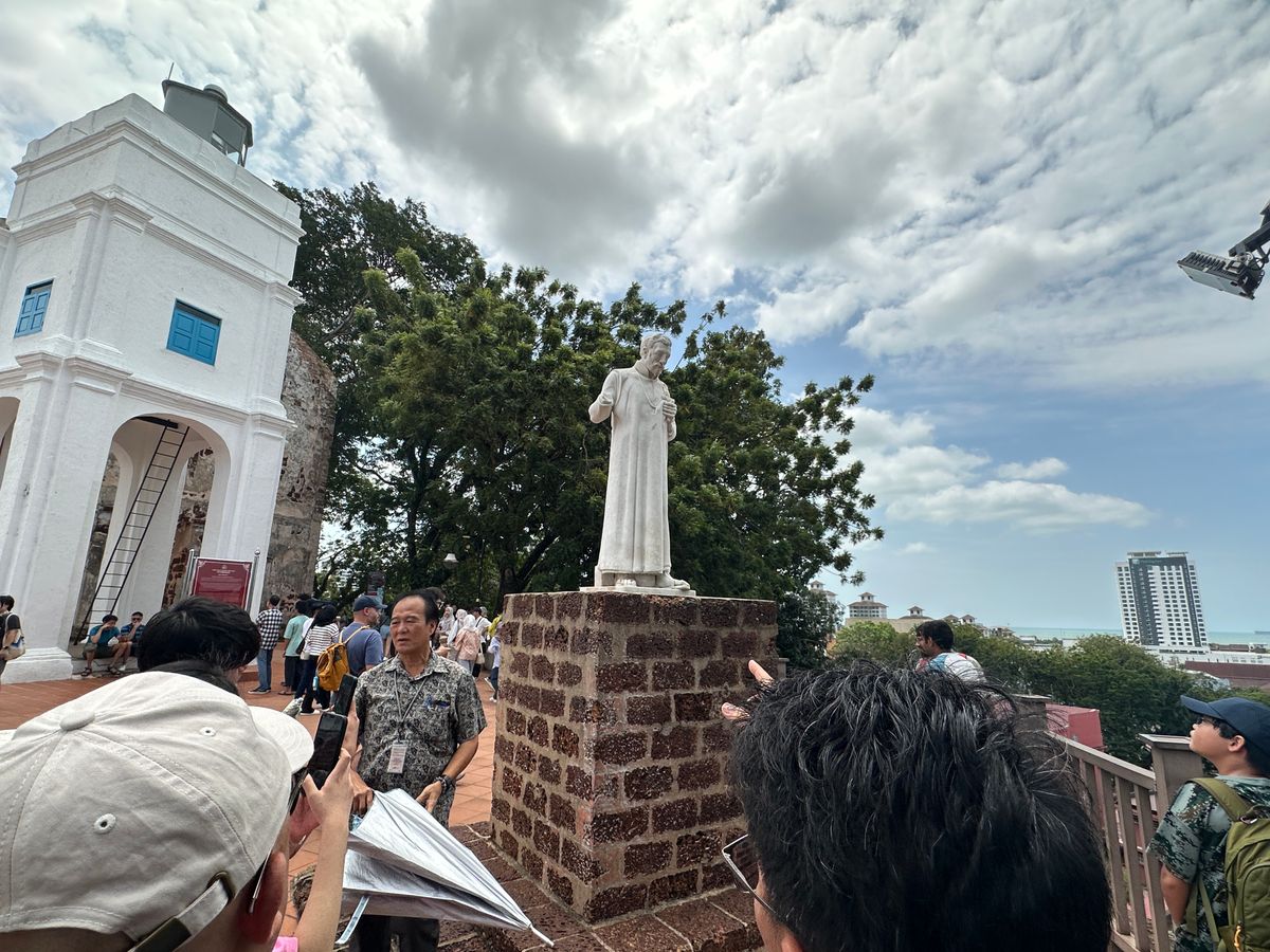 マラッカには8時頃に到着し、物流を支える運河として活用したマラッカ川の両岸辺の中世時代の風景を見て、マラッカのイメージ風景となっているオランダ広場、ポルトガルがオランダとの戦に備えて築城し実際に使った大砲が置いてあるサンチャゴ砦、マラッカ海峡を良く見渡せるセントポールの丘にポルトガルが築いたセントポール教会を見ました。イエズス会宣教師ザビエルの遺骨が貿易風の向きが変わる間の9か月間この教会の地下で安置された後に、帆船でインドのゴアに移されたとの事で、マラッカ海峡を見守るようにザビエル像が立っていました。死後の右腕はローマ法王に届けられ聖腕と呼ばれています。