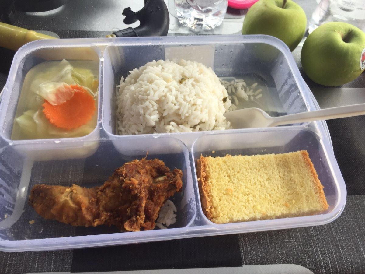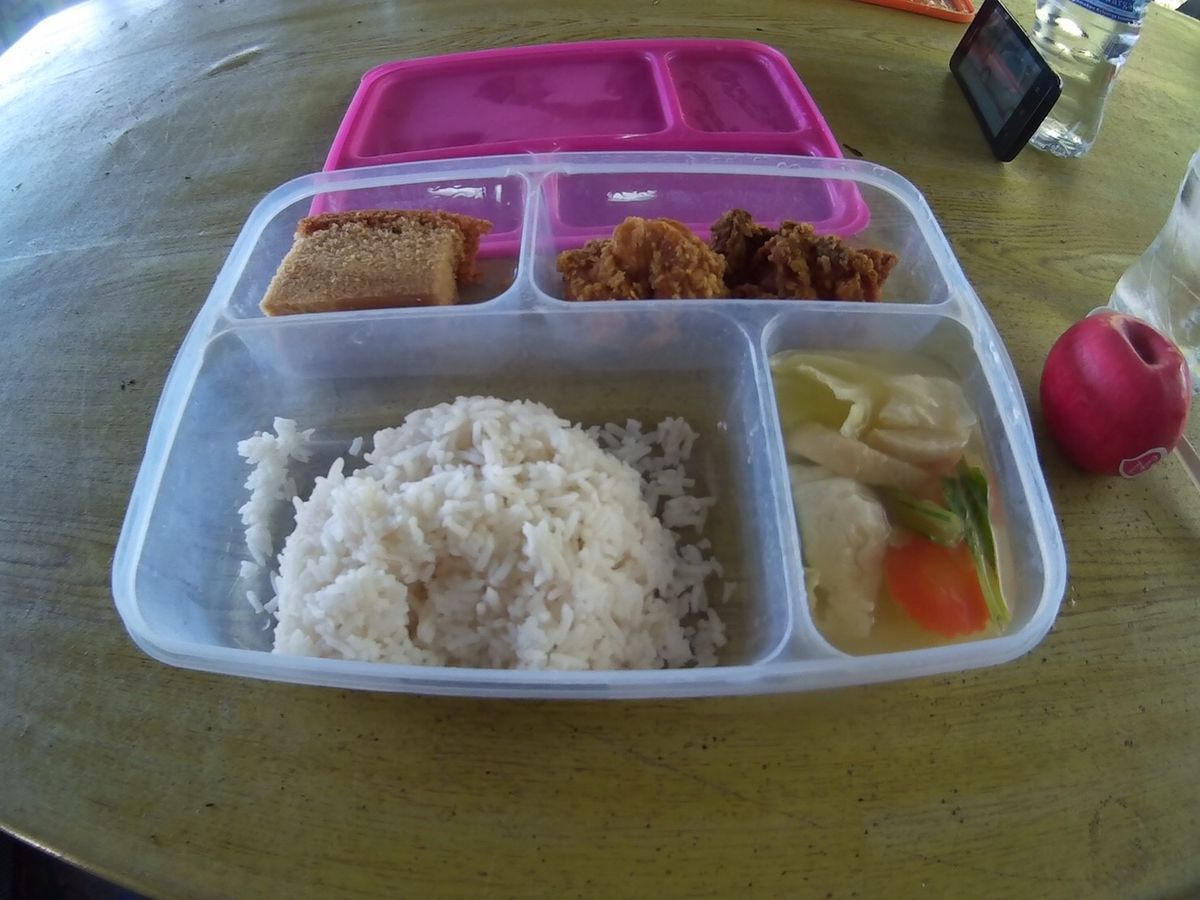 ランチボックスは、白米、味気の無い野菜スープ、小さなフライドチキン、パウンドケーキ、リンゴ。