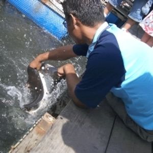 養殖所で自分の手のひらからエイに餌をあげたり、